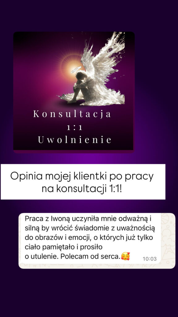 Jeśli potrzebujesz jeszcze głębszej pracy to zapraszam cię do sesji Hipnozy duchowej- tam pracujemy z podświadomością omijając umysł logiczny.